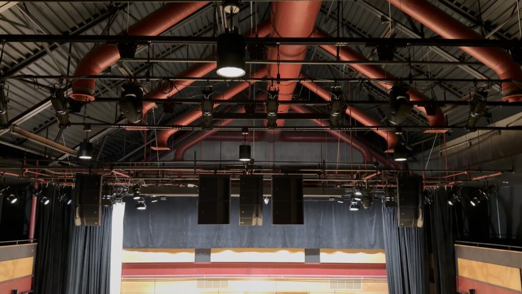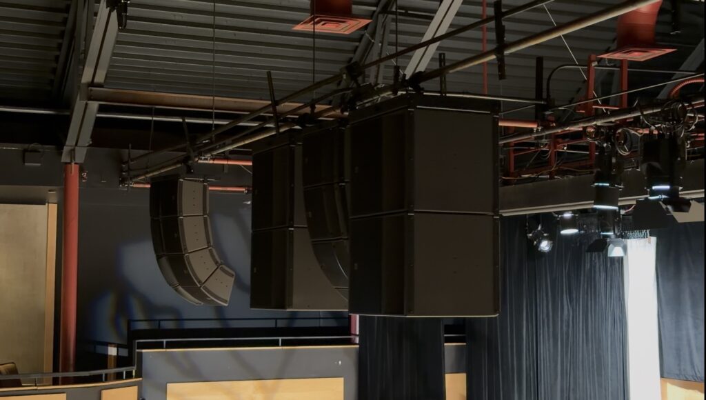 The final installation featured a sophisticated audio and lighting system designed for optimal performance and control. The sound system consisted of a Left, Center, and Right Line Array, each utilizing two L-Acoustic A10i Focus speakers and two A10i Wide speakers. Supporting low-end frequencies were four L-Acoustic KS21i subwoofers, strategically stacked stage left and stage right at house center. For delay fills, we deployed four L-Acoustics 5XT units to ensure clear sound coverage throughout the auditorium. To power this system, is the L-Acoustic LA4X Amplifier, the LA7.16i Amp Controller, and an LS10 10-port AVB Switch at Front of House. This system was designed, flown, and tuned with the utmost of precision to ensure pristine audio quality for optimal performance & longevity.