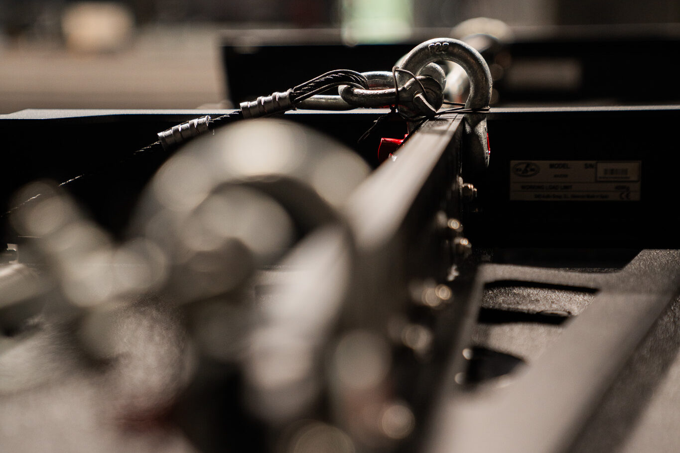 Certified overhead rigging hardware (wire rope, shackles, slings, load cells) and structural attachment points used to safely suspend heavy loudspeaker arrays, lighting trusses, and scenic elements.