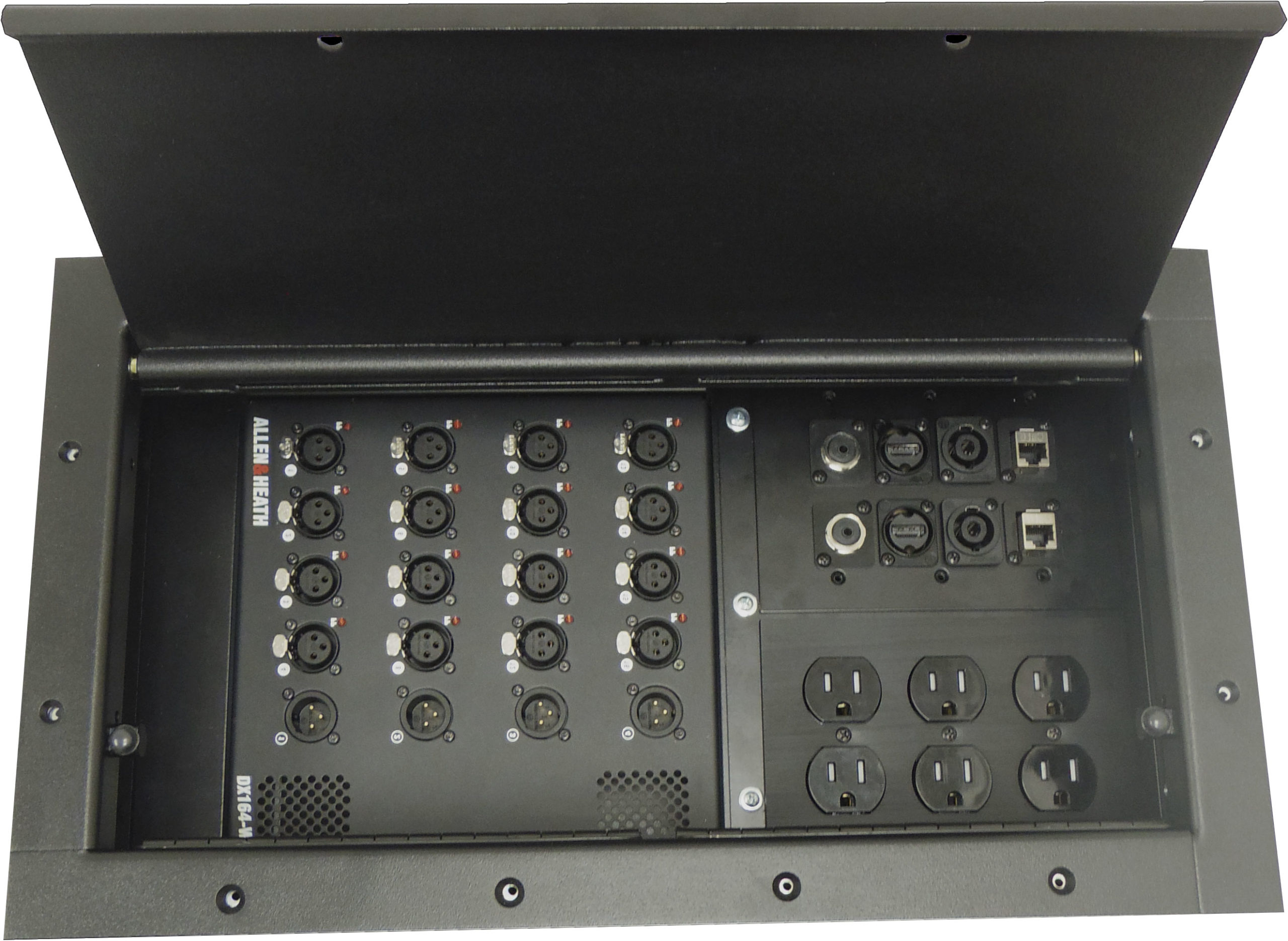 Heavy-duty, professionally labeled floor boxes and wall plates providing convenient, secure connections for microphone, loudspeaker, data, and power drops throughout the performance space and stage.